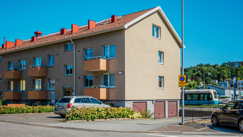 Vårt hus på Växthusgatan har två våningar plus vindsvåning och ligger parallellt med Göteborgsvägen. Här finns täta kommunikationer med spårvagn och buss som bland annat tar dig in till Göteborg och till Knutpunkt Mölndalsbro, varifrån det finns förbindelser till hela regionen.