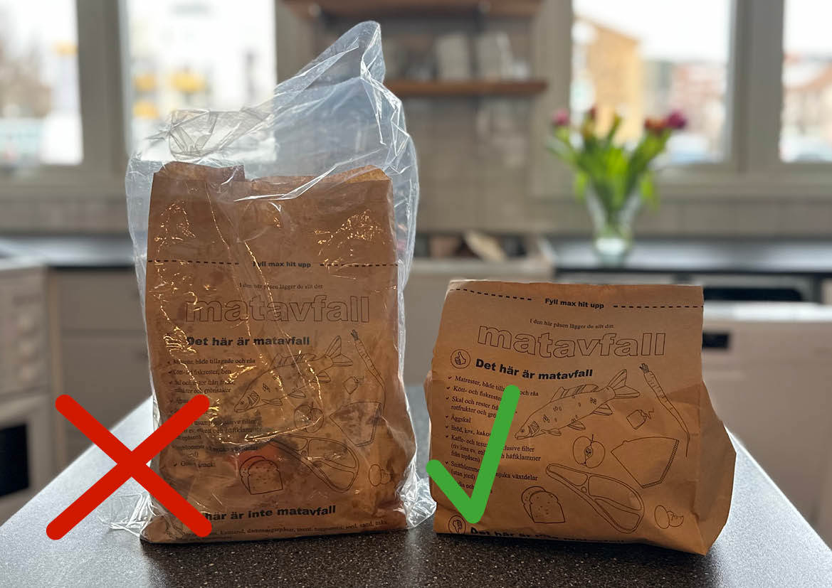 Ibland blir den bruna matavfallspapperspåsen blöt. Då kan det kännas som en bra idé att lägga den i en plastpåse. Gör inte det! Så fort det finns plast i avfallskärlet i miljörummet så kommer det sorteras ut som restavfall och brännas upp. Helt i onödan. Ditt matavfall skulle annars blivit nya resurser som gått tillbaka till miljön. Dessutom kommer avfallet kosta mer än dubbelt så mycket.