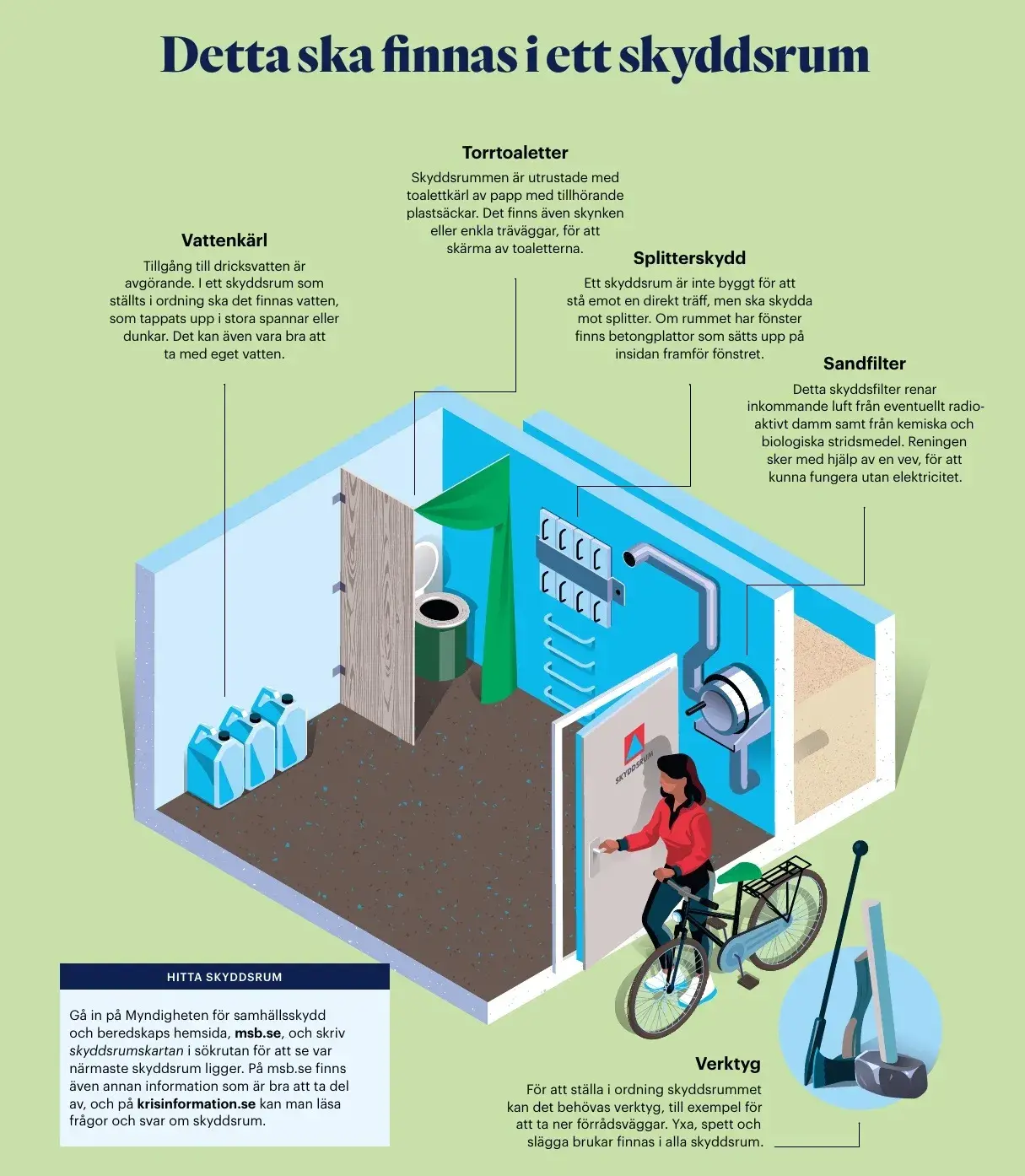Vi har skyddsrum i närheten av våra bostäder. De fungerar som källarlokaler, förråd och föreningslokaler i vardagen. De ska ställas i ordning som skyddsrum vid behov inom 48 timmar. Ett skyddsrum är byggt med förstärkta dörrar och väggar. Det har även en speciell ventilation med luftsluss. I Sverige finns cirka 65 000 skyddsrum i olika typer av byggnader.